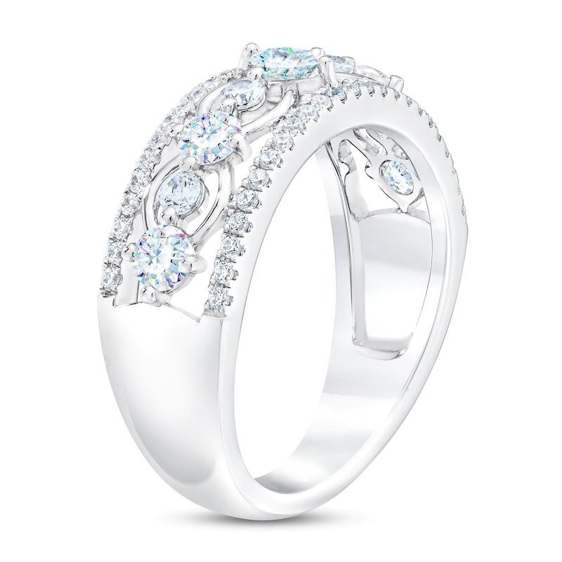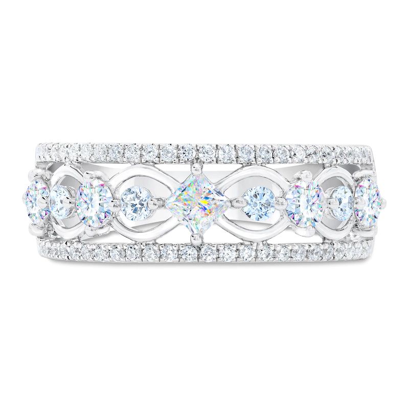 This breathtaking anniversary ring features a distinctive row of independently-certified princess-cut and round-cut diamonds, each showcasing microscopic nano-prisms for a burst of brilliant color and sparkle. Brilliant round-cut diamonds sparkle above and below, giving the ring a total diamond weight of 1 carat. The ring is crafted in iconic 14K white gold.